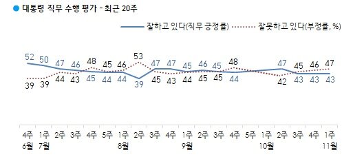 국정지지율 3주째 43%…부정평가는 3주만에 45%→47%