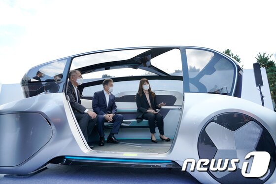 | 문재인 대통령이 30일 한국판뉴딜 7번째 현장으로 현대자동차 울산공장을 방문, '친환경 이동수단, 깨끗하고 안전하게'라는 주제로 열린 미래차 전략 토크쇼를 마친 후 정의선 현대차그룹 회장과 자율주행 기반 공유형 이동수단 콘셉트카인 현대모비스의 'M.비전S'를 시승하고 있다. 2020.10.30/뉴스1 © News1 유승관 기자 | 문재인 대통령은 지난달 30일 '수출·일자리·미세먼지, 한국판 뉴딜이 해결한다' 친환경 미래차 현장인 현대차 울산공장을 찾아 한국판뉴딜 10대 사업에 '친환경 미래 모빌리티'를 선정하고 2025년까지 전기차·수소차 등 그린 모빌리티에 20조원 이상 투자하겠다는 계획을 밝혔다.