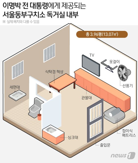 이 전 대통령은 전날 오후 구치소에 도착해 신체검사와 소지품 영치, 수용기록부 사진(머그샷) 촬영 등 절차를 거쳐 12층에 배정됐다. 수감된 방은 화장실이 딸린 4평 남짓(13.07㎡)의 독방으로, 2심 선고로 재구속됐을 당시 일주일가량 생활했던 곳이다. TV와 침구류, 식탁 겸 책상, 사물함, 싱크대 등이 배치돼있다.