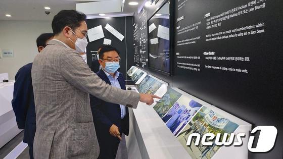 | 이재용 삼성전자 부회장이 30일 차세대 반도체 패키징 기술개발 전략을 점검하기 위해 충남 온양사업장을 방문, 반도체 생산 라인을 살펴보기 앞서 설명을 듣고 있다. (삼성전자 제공) 2020.7.30/뉴스1 | 아울러 지난 5월을 기점으로 검찰이 이 부회장을 조사하고 구속을 시도하는 등 2017년 이후 3년만에 '오너 리스크'가 재발할 수 있다는 우려가 반영된 것이라는 지적도 제기된다.