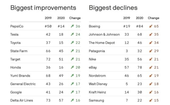 | 미국 여론조사기관 '해리스폴'이 발표한 '2020년 기업평판 순위'에서 순위가 가장 많이 상승 또는 하락한 기업 명단(자료=해리스폴) © 뉴스1 | 해리스폴은 미국에서 코로나19가 급속히 확산되는 과정에서 온라인 쇼핑을 포함한 유통업체와 헬스케어, 식음료 분야 기업들이 소비자들로부터 좋은 평판을 얻었다고 설명했다.