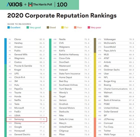 4일 업계에 따르면 미국의 여론조사업체 '해리스폴(Harris Poll)'이 최근 발표한 '2020년 기업평판 우수 100대 기업'(2020 Corporate Reputation Rankings 100) 명단에서 삼성은 평점 77.6점으로 22위에 올랐다.