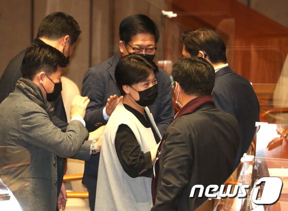 | 윤희숙 국민의힘 의원이 12일 새벽 국회 본회의에서 국정원법 개정안에 대한 무제한 토론(필리버스터)을 마치고 동료의원들의 격려를 받고 있다. 윤 의원은 12시간47분 발언해 최장 발언 기록(이종걸 전 의원·12시간 31분)을 경신했다. 2020.12.12/뉴스1 © News1 박세연 기자 | 국민의힘은 정회로 31시간26분 만에 필리버스터를 멈췄지만, 초선의원들의 결단이 원내투쟁의 불씨를 살렸다는 평가다.