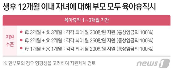 제4차 기본계획 세부 추진과제를 보면 생후 12개월이 지나지 않은 자녀가 있는 부모 모두가 3개월씩 육아휴직을 사용하면, 각각 최대 월 300만원을 지원하는 제도를 신설한다. 육아휴직을 부부가 각각 1개월 또는 2개월을 사용하더라도 한 사람만 사용하는 경우보다 지원 수준을 높였다.