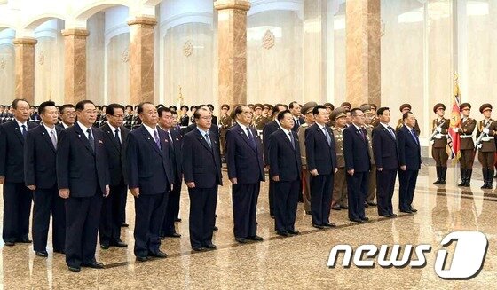 (평양 노동신문=뉴스1) = 북한 노동당과 정부의 간부들과 무력기관 책임일꾼들이 태양절(김일성 주석 생일·4월 15일)을 맞아 금수산태양궁전을 15일 찾았다고 노동당 기관지 노동신문이 16일 보도했다. 금수산태양궁전은 김일성 주석·김정일 국방위원장의 시신이 안치된 곳이다. 최룡해 국무위원회 제1부위원장, 박봉주 국무위원회 부위원장, 김재룡 내각총리 등이 참배했다. 김정은 국무위원장은 참배를 하지 않은 것으로 보인다. [국내에서만 사용가능. 재배포 금지. DB 금지. For Use Only in the Republic of Korea. Redistribution Prohibited] rodongphoto@news1.kr