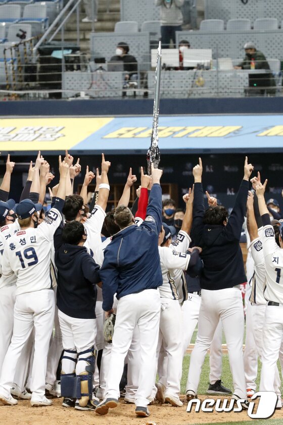 | 24일 오후 서울 구로구 고척스카이돔에서 열린 프로야구 2020 신한은행 SOL KBO 포스트시즌 한국시리즈 6차전 두산베어스와 NC다이노스의 경기에서 4대2로 승리해 한국시리즈 우승을 확정한 NC 선수들이 기뻐하고 있다. NC다이노스는 한국시리즈에서 두산베어스를 상대로 전적 4대2로 누르고 창단 9년 만에 KBO 프로야구 첫 통합우승을 달성했다. 2020.11.24/뉴스1 © News1 이승배 기자 | 상반기 그렇게 이름을 알린 NC다이노스는 집행검 세리머니로 이번 하반기 또 다시 외국 야구팬들의 입에 오르내리게 됐다.