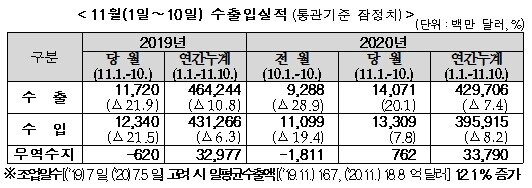 11월 1∼10일 수출이 전년동기대비 20.1%, 일평균 수출도 12.1%씩 증가하는 등 상큼한 출발을 보였다.