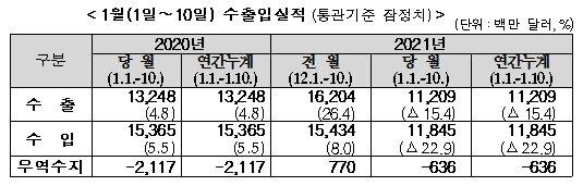 1월1∼10일 수출과 수입 모두 전년동기대비 감소했다. 다만 조업일수를 고려한 일평균수출액은 증가했다.