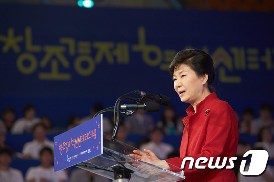 지난 2015년 8월 대전 대덕연구단지 카이스트에서 열린 창조경제혁신센터 페스티벌 개막식에 참석한 박근혜 당시 대통령.  (청와대 제공) 2015.8.27/뉴스1 © News1