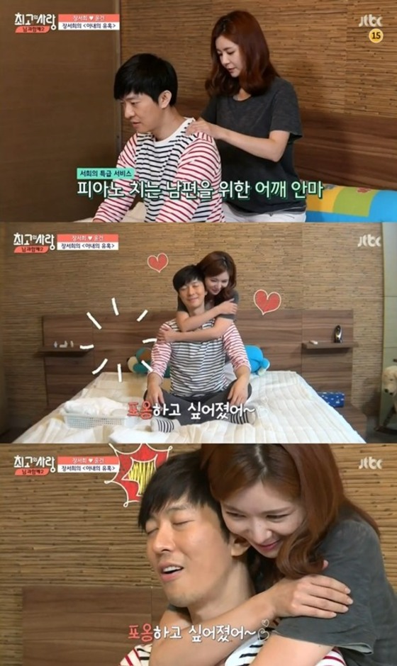 장서희 윤건이 수위 높은 스킨십을 선보였다.장서희는 지난 23일 밤 9시40분 방송된 종합편성채널 JTBC ‘님과함께 시즌2-최고의 사랑’에서 침대에 있던 윤건에게 다가가 “이런 자세는 어때요?”라며 윤건을 덮칠 듯한 자세를 취했다. 이에 윤건은 놀란 입을 다물지 못했고 장서희는 준비한 마사지를 시작했다.장서희는 윤건의 어깨를 안마하던 중 “뒤에서 안마하고 있으니까 갑자기 이렇게 하고 싶었다”며 백허그를 선사했다. 윤건의 갑작스러운 장서희 행동에 행복한 미소를 지었다.
